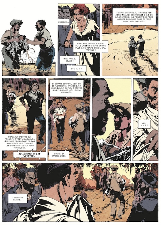 Au gré d’une intrigue dense, Pelaez tisse un récit choral où les sous-intrigues s’entrelacent sans jamais diluer la tension: un pasteur dissimulant de sombres secrets, une romance impossible entre classes et couleurs, le Parti Communiste tentant d’unir des travailleurs blancs et noirs partageant la même misère, un détenu en cavale animé par la vengeance, la menace diffuse du Ku Klux Klan… autant d’axes de lecture qui finissent par dépasser le simple polar historique pour composer une fresque sociale. Celle de l’Amérique sudiste hantée par la défaite de la guerre de Sécession, gangrenée par le racisme et une nostalgie mortifère encouragée par une foi aveugle et une violence banalisée. L’atmosphère est lourde et oppressante, soulignée par le trait marqué de Labiano sur les visages, les jeux d’ombre, les cadrages serrés des personnages et les teintes chaudes de Maffre.