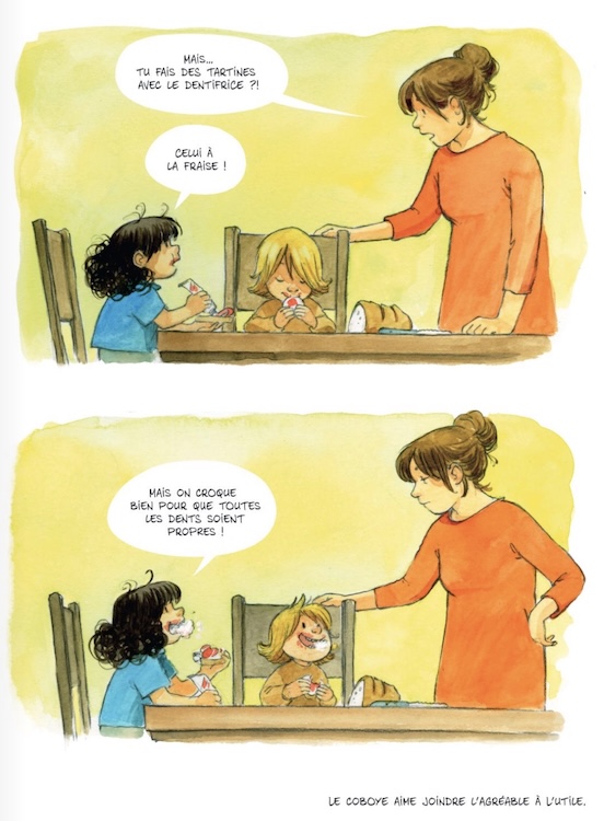 La petite brunette qui ne tient pas en place, c’est un peu l’autrice avoue-t-elle mais c’est aussi forcément aussi un peu de nous tous enfants. Ainsi, « comme on retrouve un carton de photos oubliées dans un grenier », elle nous propose une succession de saynètes simples lancées par une petite phrase d’introduction sur les intentions du coboye et se concluant souvent par une autre phrase où le fameux coboye a été rattrapé par la dure réalité, souvent incarnée par le shérif (alias la maman de Cécile) qui veille au grain…