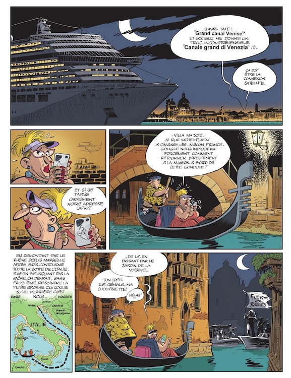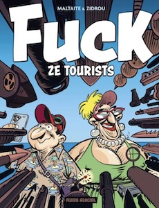 De la chasse aux touristes débarquant des navires de croisière dans Venise à une petite île des Maldives s’enfonçant dans l’eau sous la surcharge pondérale des vacanciers, en passant par le Machu Picchu, les safaris en Afrique ou les amateurs de selfies devant les grilles d’Auschwitz, « Fuck ze tourists » s’attaque au surtourisme et ses conséquences, bien aidé par les réseaux sociaux. Avec dans les bagages de Zidrou et Maltaite, des touristes sans pudeur et sans gêne, beaufs et idiots au possible.