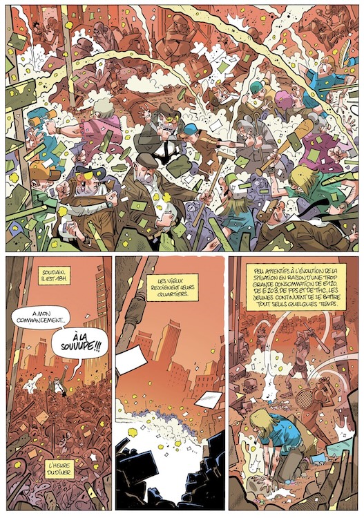 Dans ce second recueil d’historiettes au trait expressif, nous sommes deux ans après la grande révolte des jeunes causée par le retrait des trottinettes en libre-service. Dans un décor urbain apocalyptique, jeunes et vieux se livrent donc à une véritable guérilla à grands renforts d’actes de sabotage, d’infiltrations, d’opérations commando et autres stratégies militaires. Objectif assumé par l’auteur de « Cosmik Roger » ou « Forbidden zone »: se moquer de notre société contemporaine en détournant les traits de caractère supposés antagonistes des deux clans. Les séniors tentent ainsi par exemple d’éloigner les jeunes de leur territoire en leur jetant des légumes verts en diffusant du Jean Ferrat tandis que les jeunes coupent la télévision pile à l’heure de « N’oubliez pas les paroles » de Nagui.