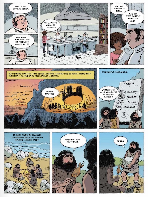 Souhaitant visiblement éviter une construction purement chronologique, les auteurs ont opté pour un fil conducteur dans le présent: c’est un chef qui s’apprête à raccrocher qui raconte l’histoire de la gastronomie, tandis que sa fille qui va lui succéder interviewe des cuisiniers célèbres disparus et des personnalités du milieu. Alors que la partie historique est déjà très dense avec les évolutions des goûts, des techniques et des matériels à raconter en seulement 160 pages, cette mini-histoire parallèle rend du coup la lecture un peu confuse. Les cases détaillées mais aussi très chargées de Bernard Deyriès (« Ulysse 31 », « Les Mystérieuses cités d’or ») n’arrangent pas les choses.