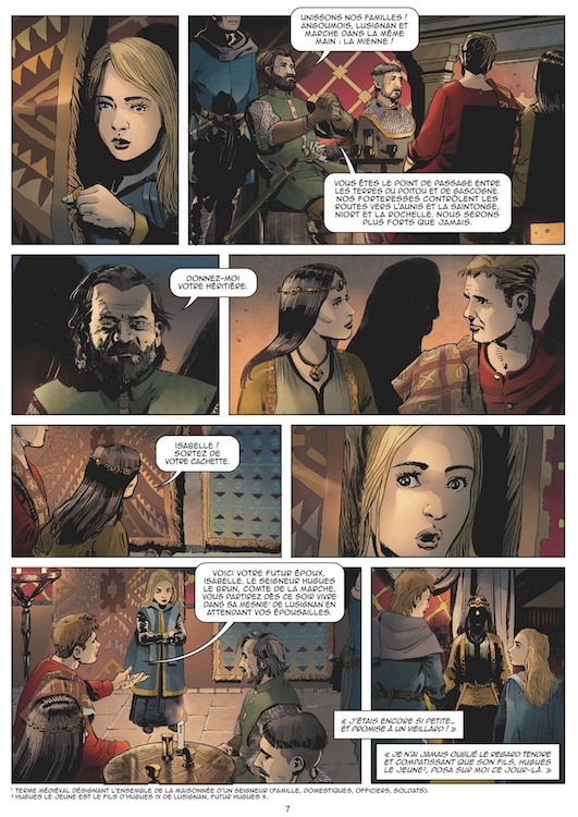 Revers de la médaille, la narration manque un peu de rythme, la personnalité d’Isabelle reste encore peu développée et le récit s’avère très dense, en particulier pour le lecteur qui connaît peu cette période et qui risque de se perdre dans cet énorme arbre généalogique royal et les nombreuses notes de pied de page. A cet égard, un court texte de présentation sur la situation de la « France » au moment de la naissance de l' »empire Plantagenêt » permet tout de même de poser quelques bases. Et surtout il peut être judicieux d’aller lire le dossier final avant d’entamer la lecture de la bande dessinée.