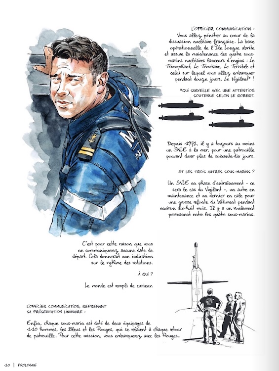 Douze jours pour découvrir la vie à bord dans un espace clos et suivre des exercices de combat et de simulation de tir nucléaire. L’ensemble chapitré est construit sous la forme d’un reportage dessiné avec du texte explicatif et des entretiens avec des membres d’équipage, encadrant des dessins réalistes signés de Titwane (« Photographes de guerre » avec Pellicier, grand prix des Galons de la BD). Le tout est bien équilibré et même si l’on sent parfois une certaine réserve sur un sujet évidemment contraint par le secret-défense, l’immersion se révèle très instructive.