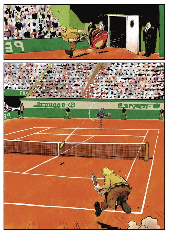 Fan de tennis, sport pratiqué par plus d’un million de licenciés en France, Grégory Panaccione (« Un océan d’amour », « Chronosquad ») en connaît en rayon sur le sujet. Après «Match» dans lequel il suivait sans aucun dialogue une rencontre point par point, puis le premier tome de « L’Encyclopédie du tennis », on retrouve Marcel Costé, joueur de tennis improbable, ventripotent, chevelure de Rahan au vent, chemise moyenâgeuse sur le dos et chaussures de sécurité aux pieds.