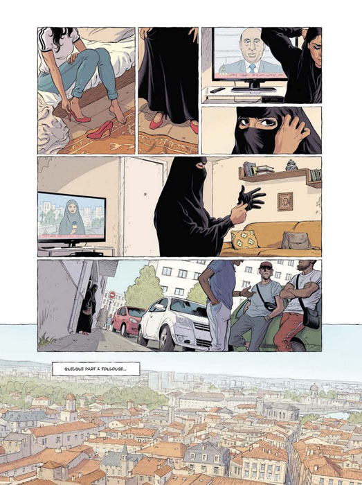 Mais cela ne suffit pas. Le trio Trevidic-Matz-Liotti, déjà réunis sur « Compte à rebours » autour du même sujet du jihadisme, signent certes ici un one-shot aux ambitions réalistes. Passée la scène d’ouverture forte montrant un avion s’écraser sur la Tour Eiffel (mais heureusement c’était un rêve…), on suit le lavage de cerveaux anti-occidental de ces jeunes femmes en talons aiguilles, leurs réunions secrètes et leurs préparatifs d’attentats mais leur portrait et leur parcours personnel ne sont qu’esquissés, laissant le lecteur à distance. Côté enquêteurs, les informations sont au contraire documentées mais que ces séquences sont longues et bavardes! Qu’elles aient lieux dans un bureau ou sur un cours de tennis (!), elles cassent le rythme et ennuient alors que d’autres scènes comme celle des aveux sont expédiées en quelques cases. Quant au dessin, trop figé et trop caricatural, il n’est guère plus convaincant.