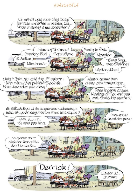 Sylvain Frécon garde le rythme et parvient à se renouveler dans des gags en une planche au trait caricatural et expressif. Longue vie aux mémés!