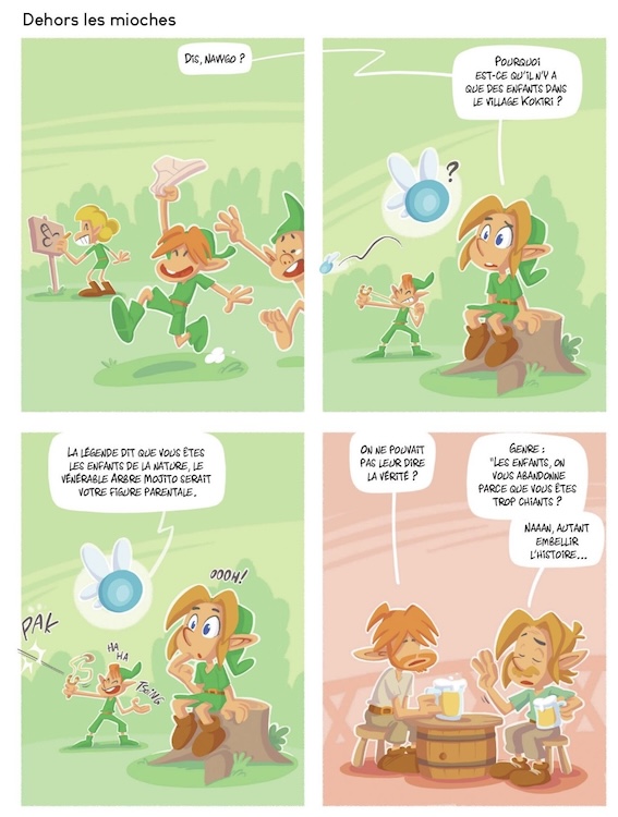 « Ze legend of Zelgag » en est évidemment une parodie où l’on retrouvera les personnages principaux et des références au jeu vidéo. La succession de gags en une page et quatre cases, imaginés par Pirate Sourcil (déjà auteur de « Fightnite bataille royale », « Super Nintenbros » et « Zéro Pièce » dans la même collection Parodies de chez Jungle), offre une variété de situations, plutôt centrées sur le quotidien de Link, pardon Kink ici. Pas vraiment besoin d’être fan, on suivra notre héros en train de brutaliser sa fée, de se battre contre des poules ou de détourner ses pouvoirs autrement que pour sa quête.
