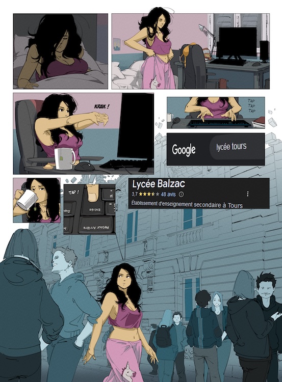 M.E. Je cherchais un dessinateur avec un style glam, proche de certains manga mais plus encore, de certains comics. En effet, cette histoire montre aussi des ados prenant le bus pour aller au lycée dans la France d’aujourd’hui, et je craignais qu’on tombe dans un ordinaire un peu fade. Or, dans mon esprit, ces ados devaient être des super-héros (comme ils se vivent eux-mêmes d’ailleurs). Jérôme Savoyen – qui n’avait jamais fait de BD et que j’ai repéré sur Instagram – a dépassé mes attentes, apportant de surcroît plein de super idées de mise en scène, par exemple dans la manière de représenter le web et le darknet. On s’entend tellement bien qu’on a prévu de faire trois albums encore ensemble – dont un est déjà bien avancé. Jérôme a beaucoup de ressources et plusieurs styles graphiques dans ses crayons.