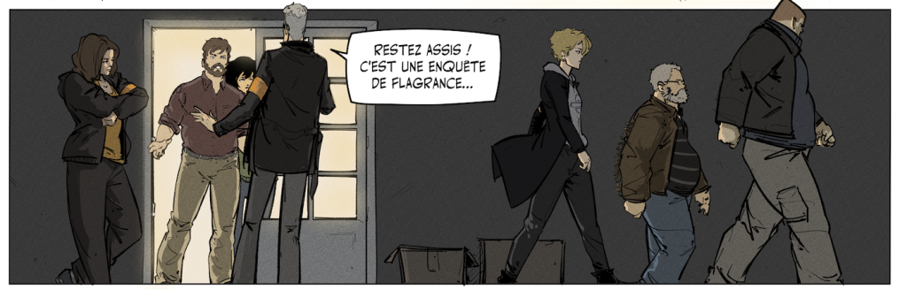 Par ailleurs, c’est moi qui fais le suivi de tout le processus avec le dessinateur, essais, storyboard, encrage, couleurs, et ce, quotidiennement, car Henri est un gars légèrement occupé à autre chose. Mais quand j’ai besoin de précision sur tel ou tel détail de procédure, de hiérarchie, d’équipement, ou de savoir si une péripétie qui m’arrange est vraisemblable ou non, on continue d’échanger tout du long.