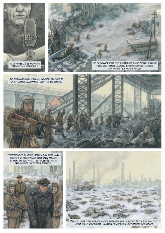 Pour ma BD, je me suis inspiré de la trajectoire du parrain de ma grand-mère, qui fut Malgré-nous sur le front de l’Est avec la Wehrmacht, puis déserteur allemand dans la France de Vichy, pour finir soldat engagé volontaire dans l’armée Leclerc durant toute la campagne d’Italie et qui a contribué à libérer Strasbourg. Une épopée en forme de roman que j’ai essayé de retranscrire en BD.